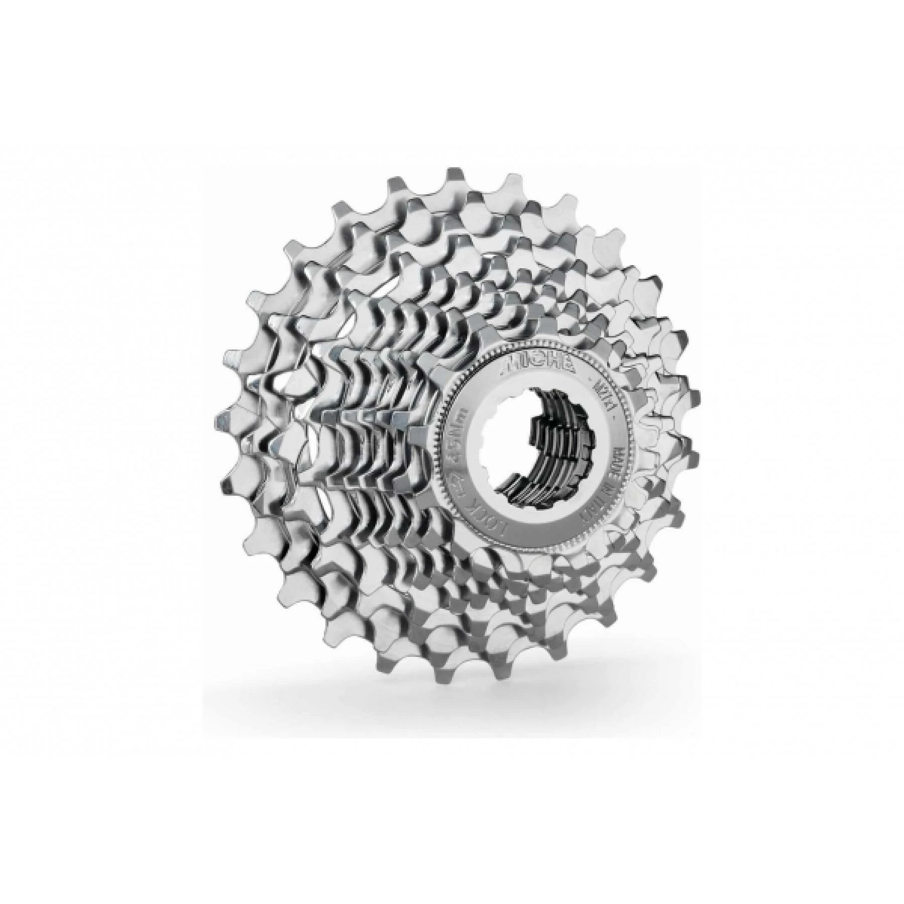 Cassette MICHE 10 vitesses Primato CA1514C patible Campagnolo .pignon usiné CNC, acier spécial chromé opaque et traité thermiquement .écrou en acier spécial chromé et traité thermiquement .entretoise en plastique .poids: env. 285 g (12-21).