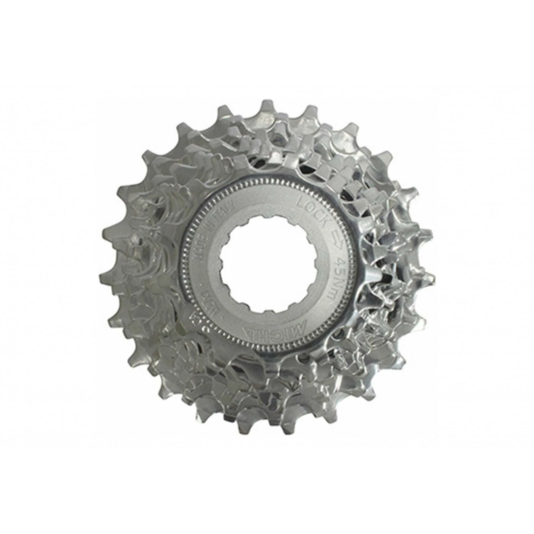 Cassette MICHE 9 vitesses Primato CA15141 patible avec Campagnolo.pignon et écrou en acier spécial chromé et traité thermiquement .entretoise en plastique.