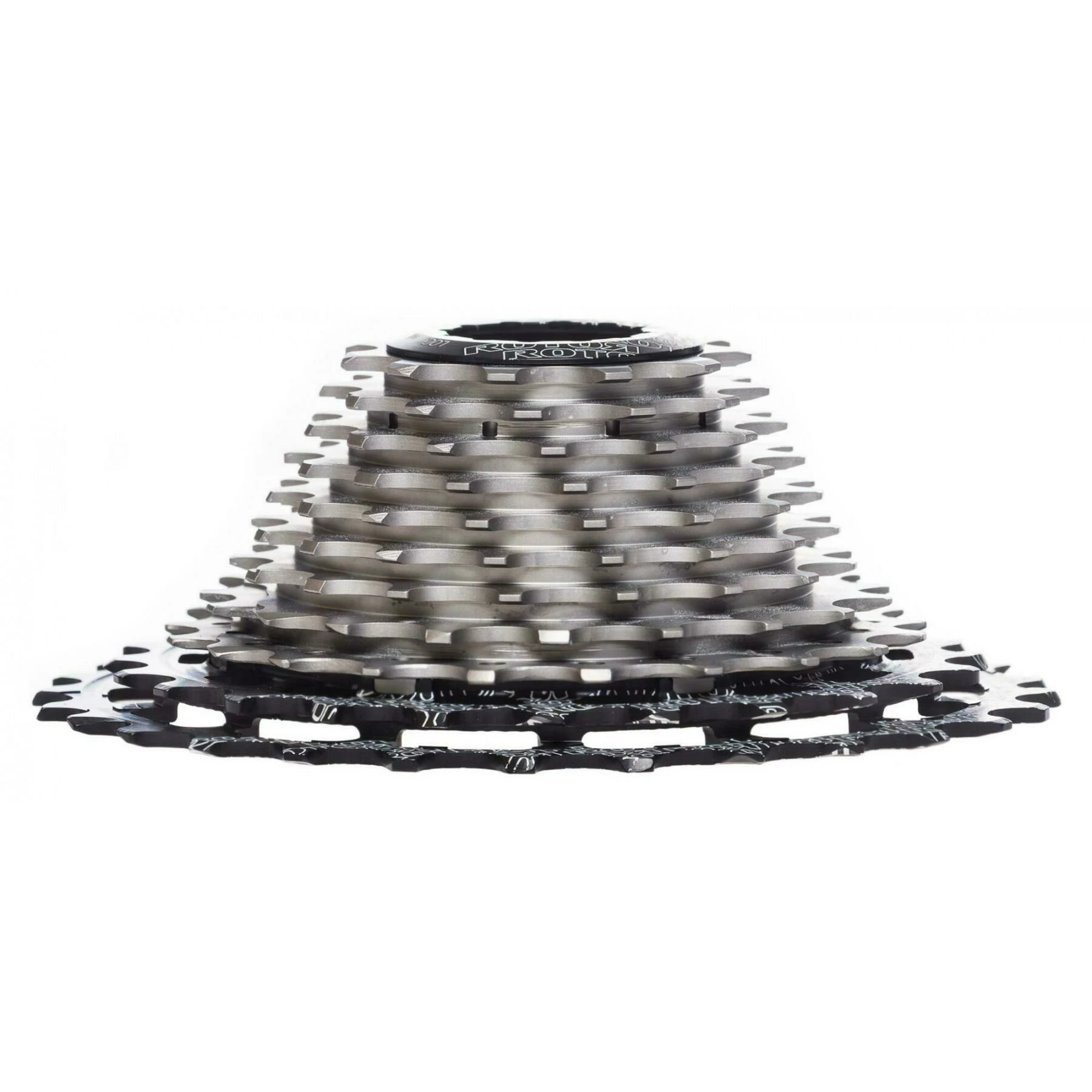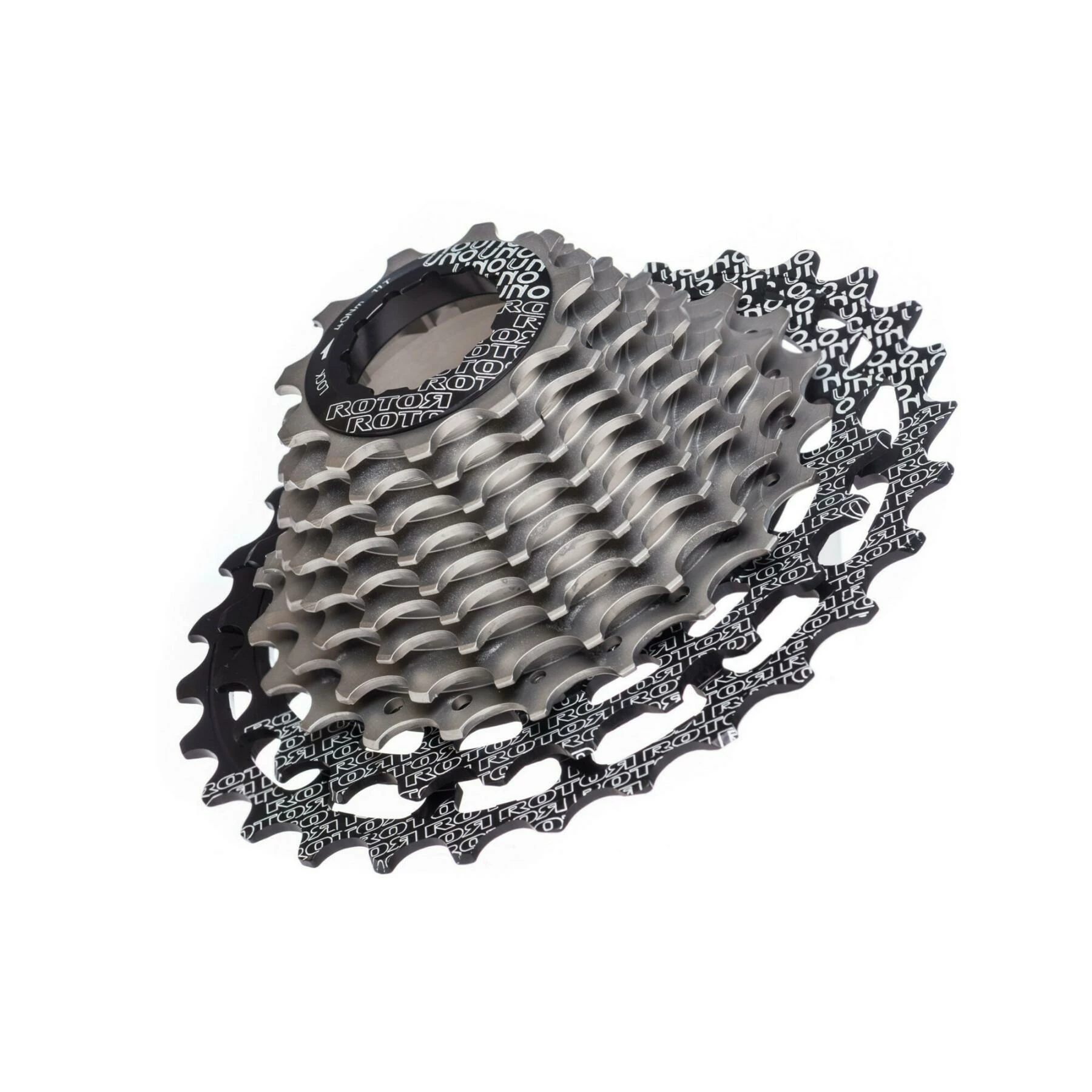 Issue du nouveau groupe Rotor UNO, cette cassette représente toute l’expérience et la qualité de Rotor. Son usinage CNC hyper précis fait de cette cassette, un composant exceptionnel de par sa qualité de fabrication. A l’image du groupe, la cassette UNO est une véritable oeuvre d’art et un exemple de légèreté et de précision. Ses 9 premiers pignons sont usinés dans un bloc d’acier unique, tandis que les 2 derniers sont en aluminium 7075, le tout relié par 7 vis Torx et une étoile de fixation assurant une rigidité optimale à l’ensemble. La zone de contact unique avec le corps de cassette permet de ne pas marquer ce dernier, notamment grâce aux angles adoucis. La cassette UNO bénéficie d’une traitement de surface spécifique permettant de réduire la friction et ainsi améliorer sa durée de vie.
