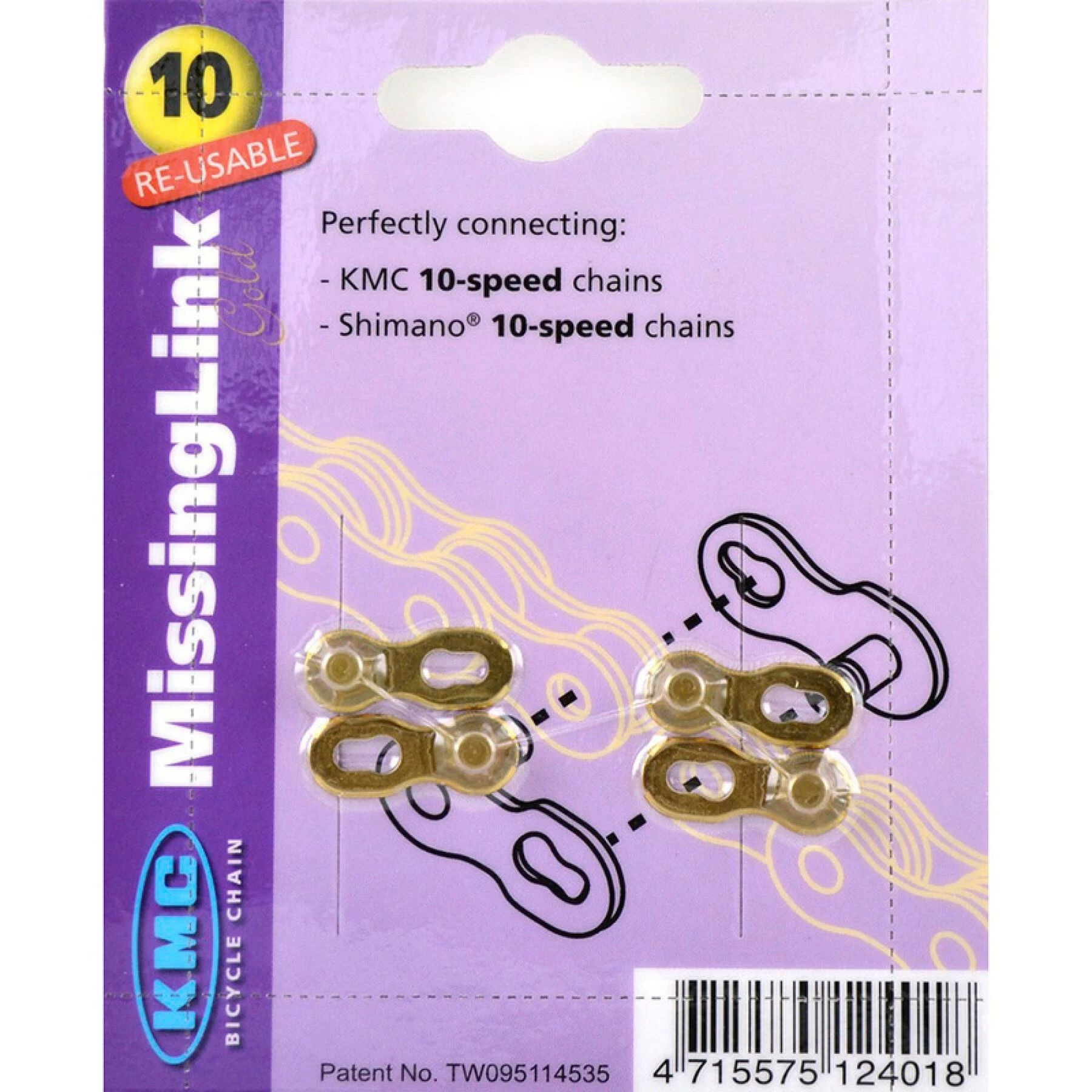 Maillon à attache rapide KMC MissingLink 10 vitesses. Blister 2 unités.1 / 2” x 11 / 128”.Taille de l’axe : 5,88 mm.Doré, Ti-N.Compatible KMC, Shimano, Campagnolo et SRAM 10 vitesses.